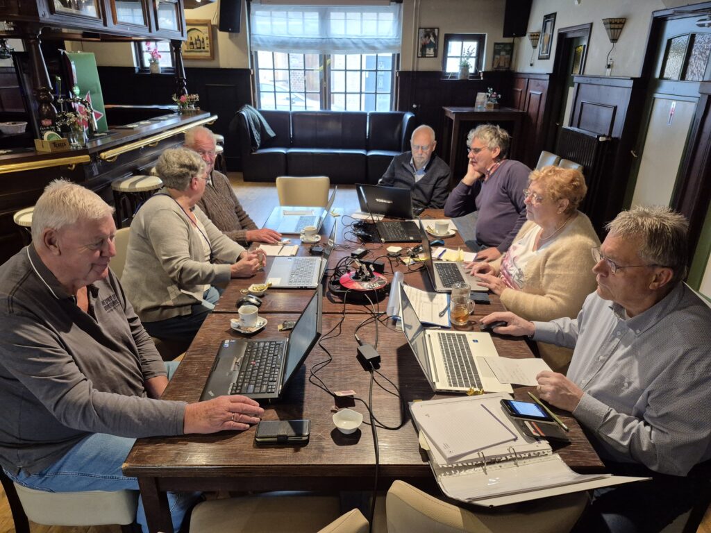 Binnen die groep vertellen de leden aan elkaar waar ze mee bezig waren en hoe ze dat doen. Er is een veelheid van bronnen die kunnen worden geraadpleegd en uitwisseling van kennis is onontbeerlijk om verder te komen. Hier onder ziet u de genealogiegroep aan het werk.